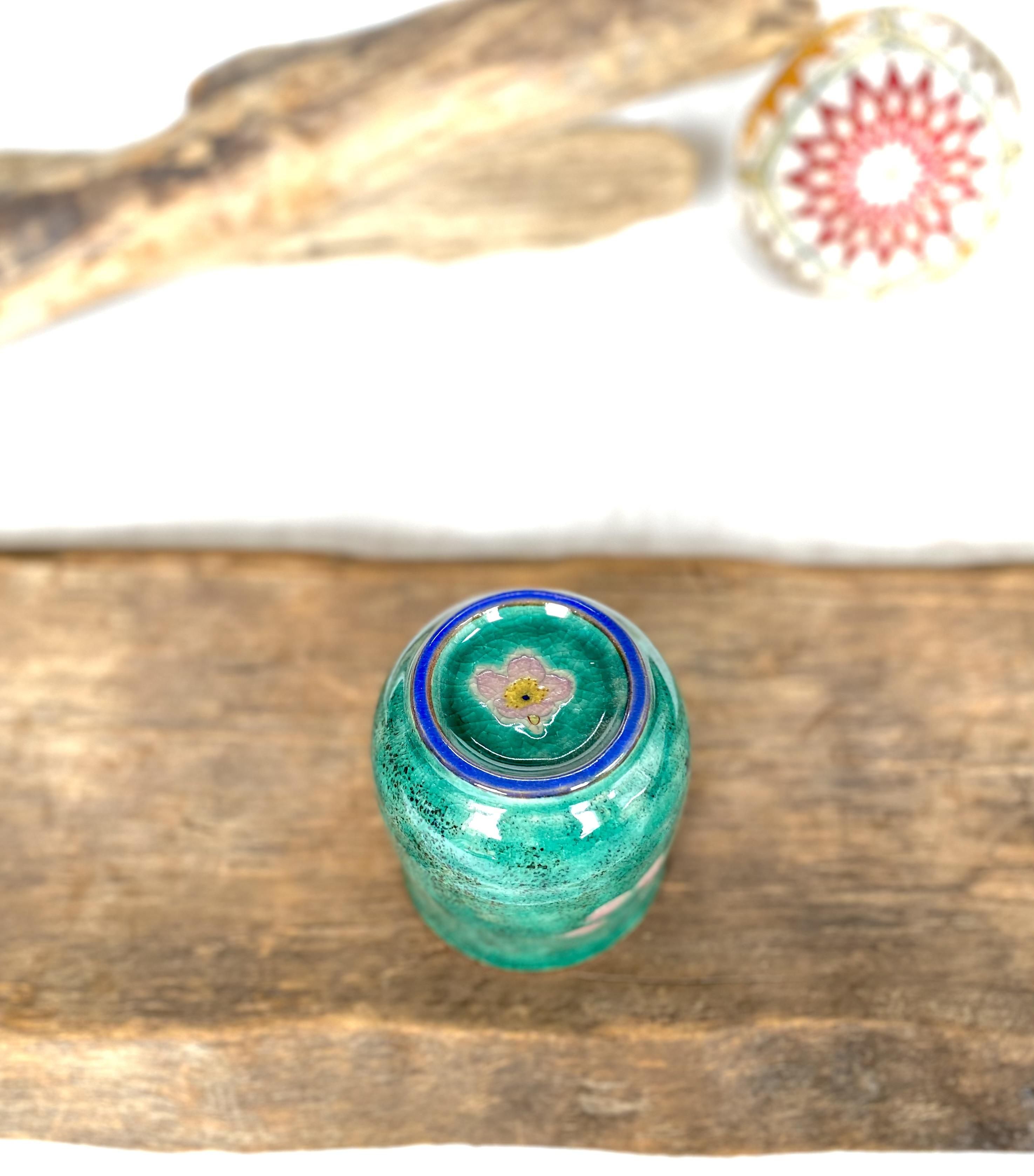 九谷焼独特の緑を手描きしてソメイヨシノは転写シール焼成の淡くやさしいお色の融合絵付けです。