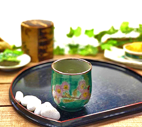 落ち着く深緑です。九谷焼のお洒落で便利なソメイヨシノお湯呑です。