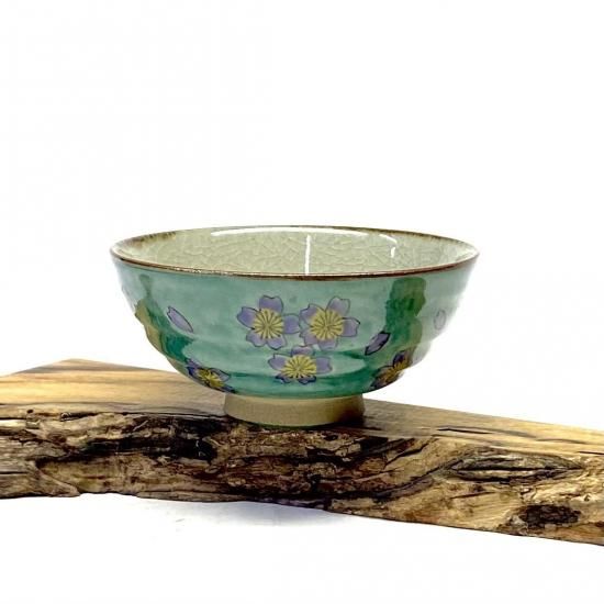 九谷焼 飯碗 茶碗 大 グリーン地桜 裏絵