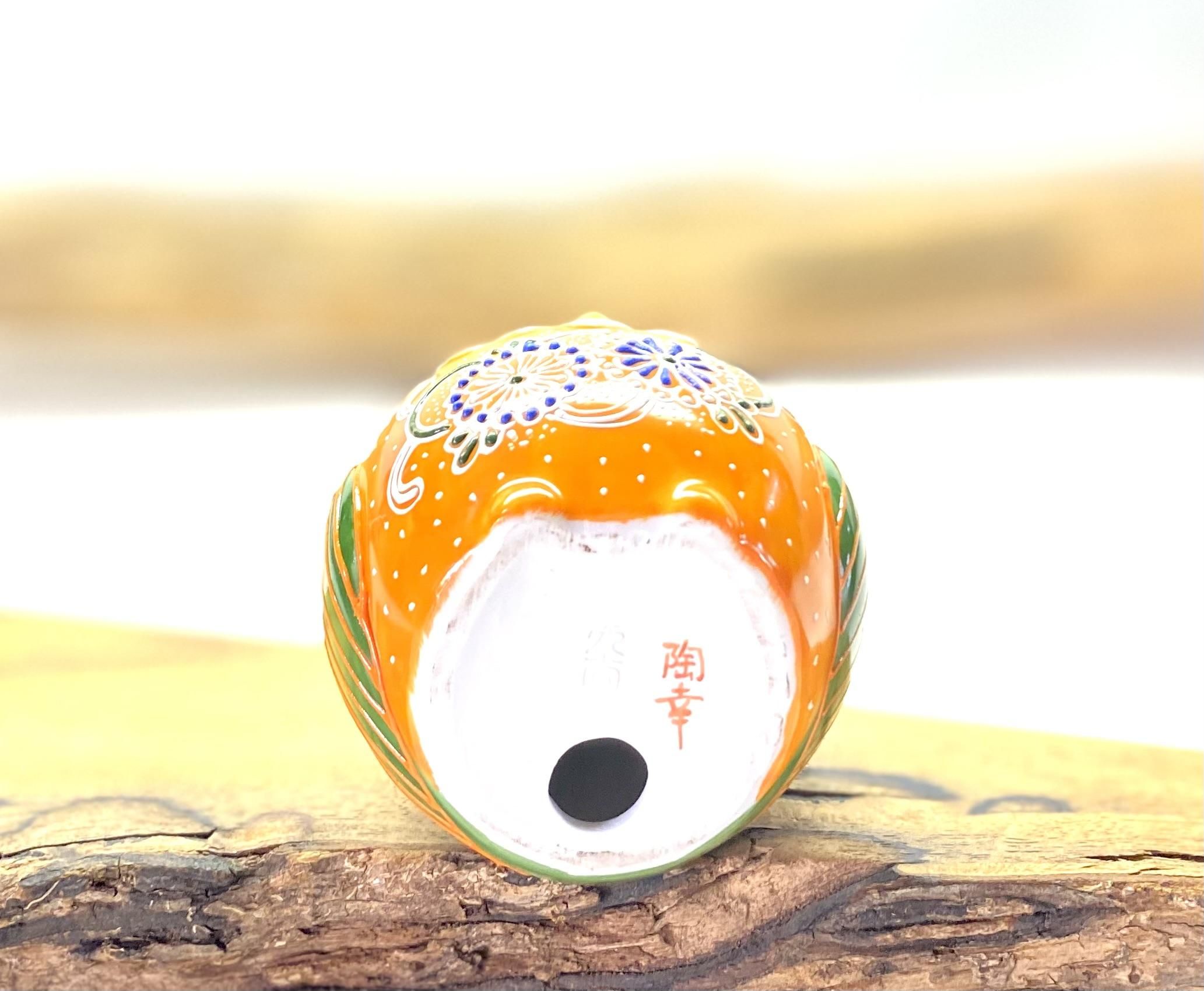 九谷焼のフクロウ。幸運を象徴し、特殊な『デコ盛』絵付け技法で製作。サイズ:高さ7.5×幅8×奥行き7.5cm。