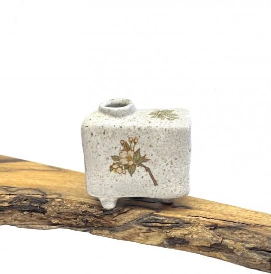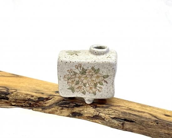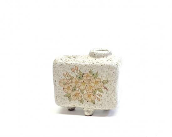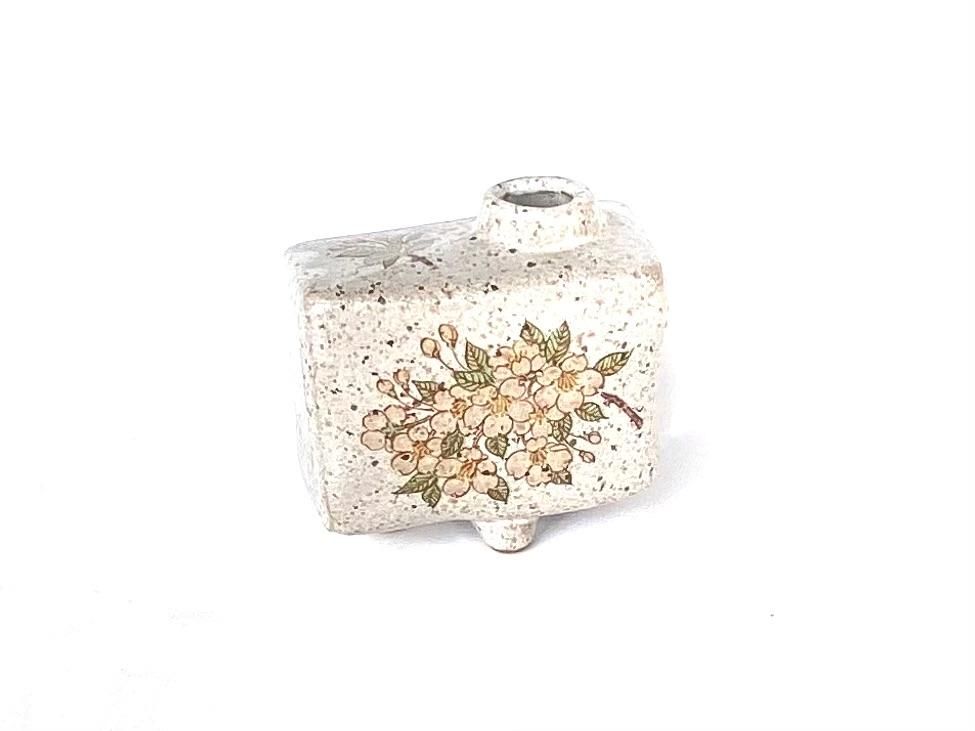 九谷焼の手の平サイズの花瓶です。シール焼の製法により、繊細な桜のイラストが美しく描かれています。淡い色合いのしだれ桜が印象的で、お部屋の雰囲気を華やかに演出します。