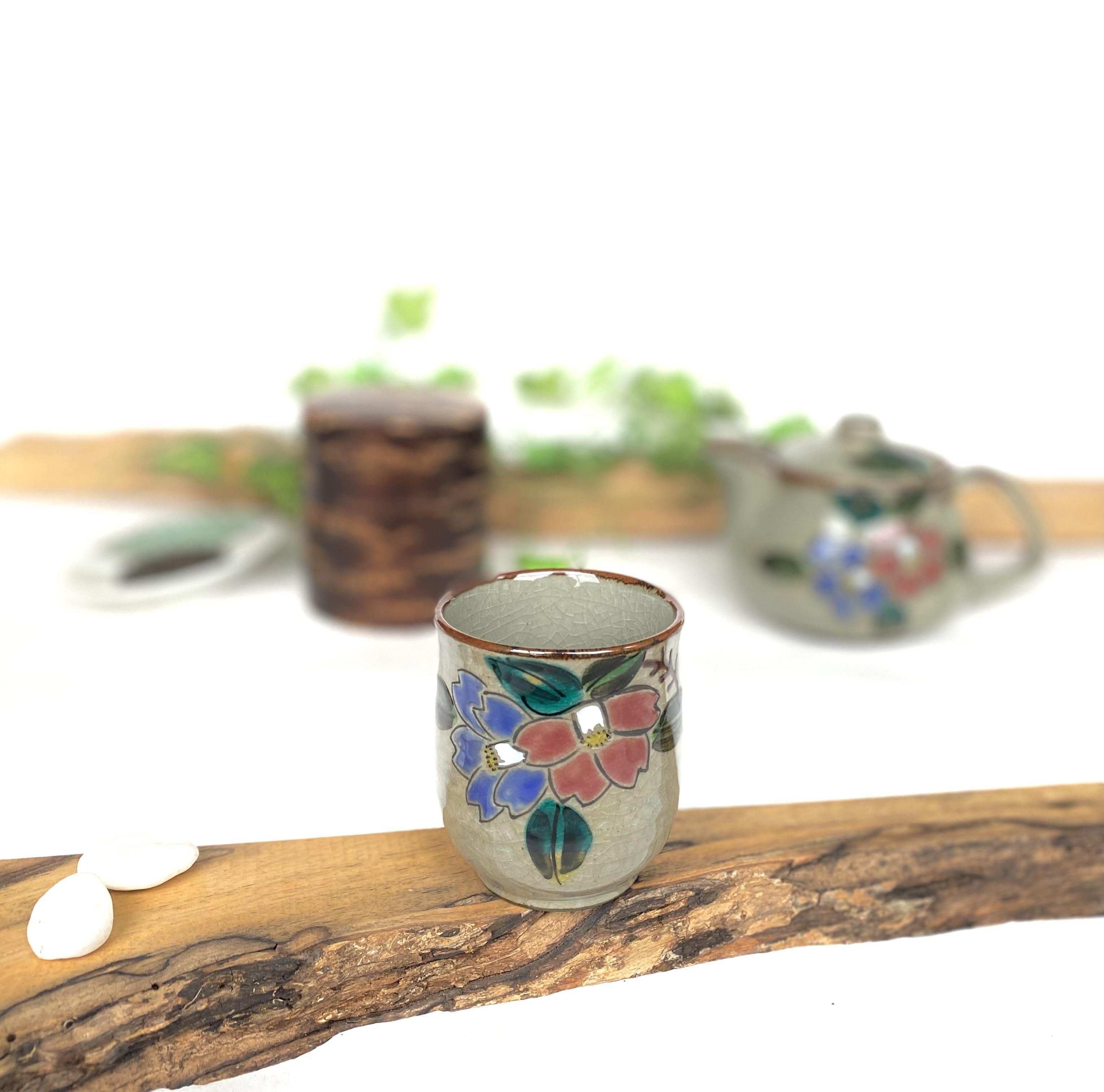 九谷焼のお洒落な五客お湯呑をご紹介します。この湯飲みは手描きの花柄が特徴で、コンビ山茶花、和桜、グリーン地桜、がく紫陽花、吉田屋牡丹の色違い展開です。