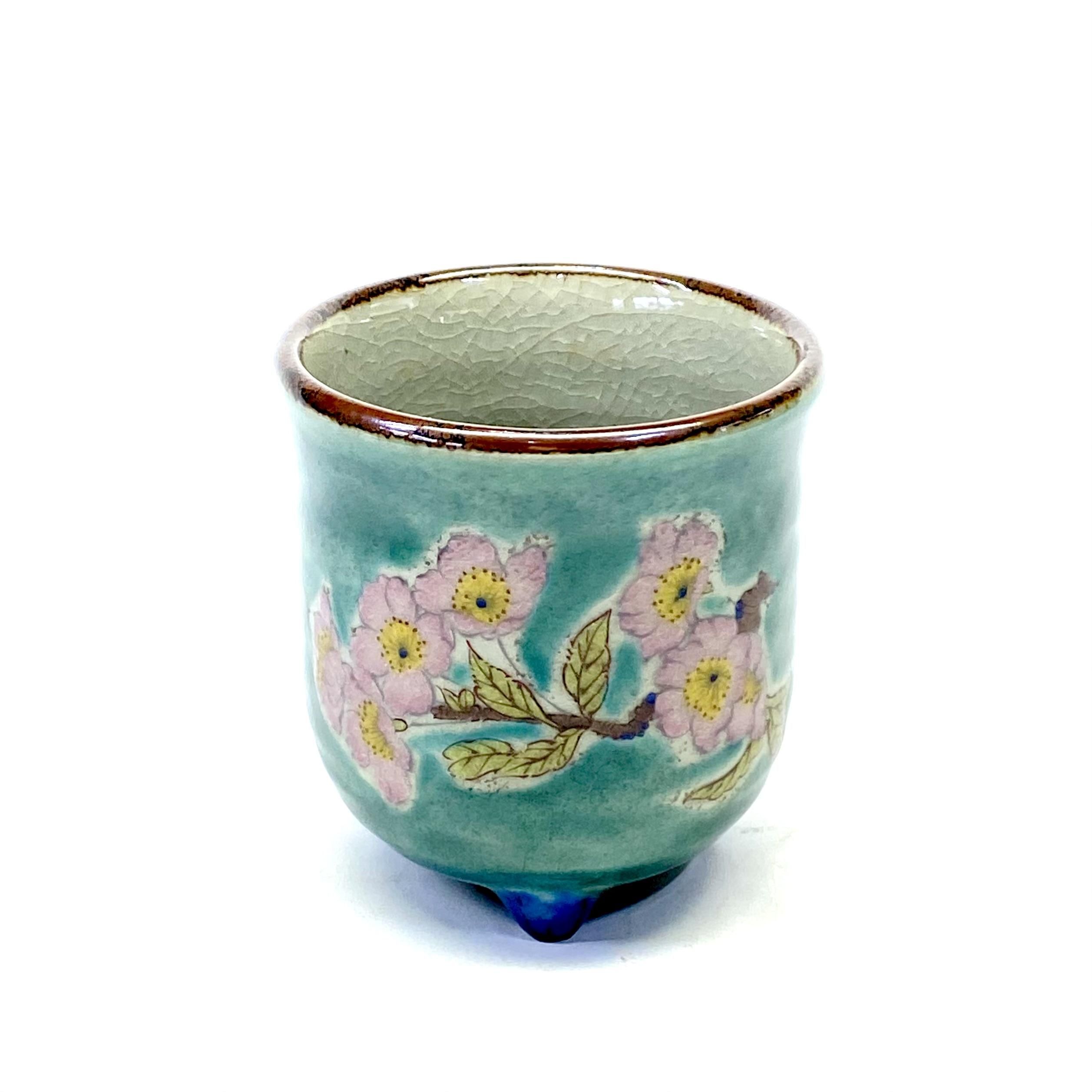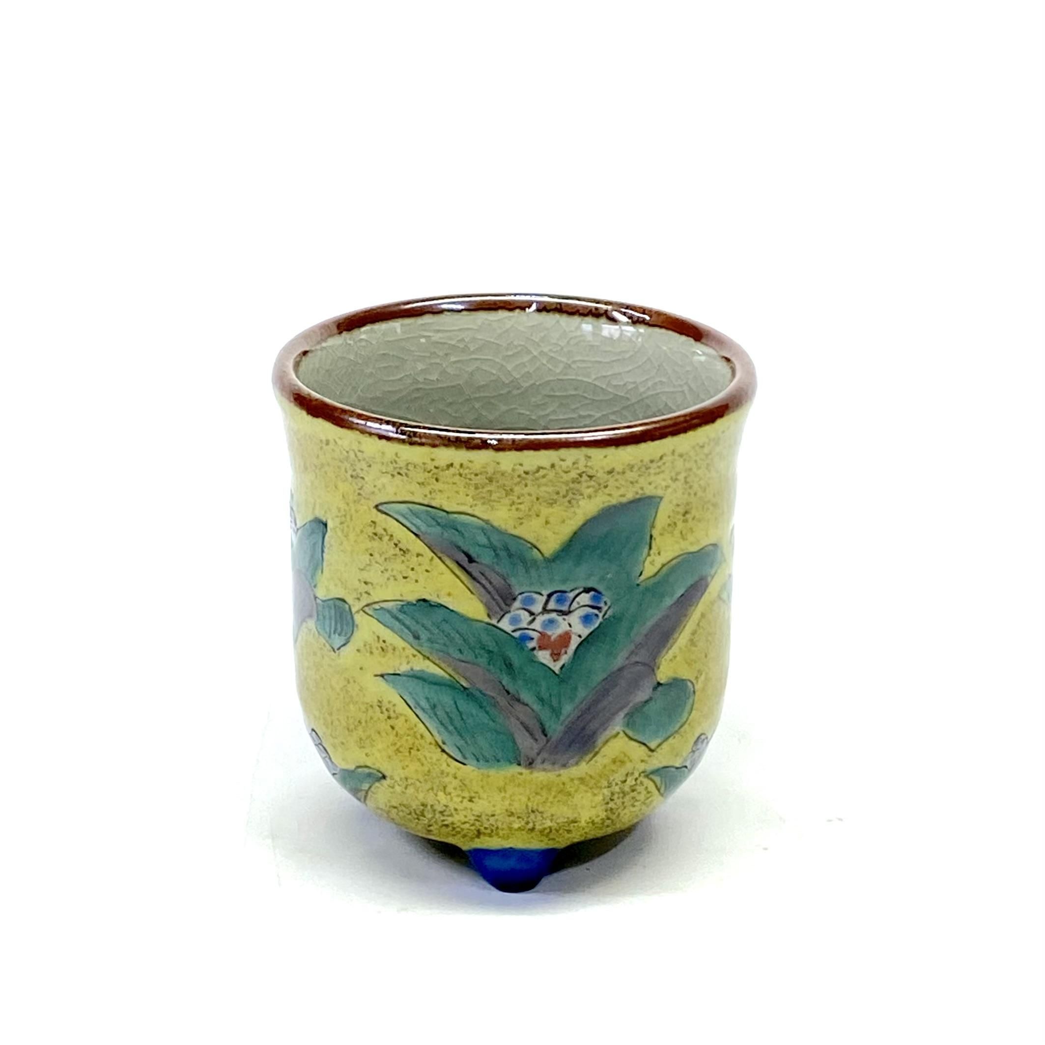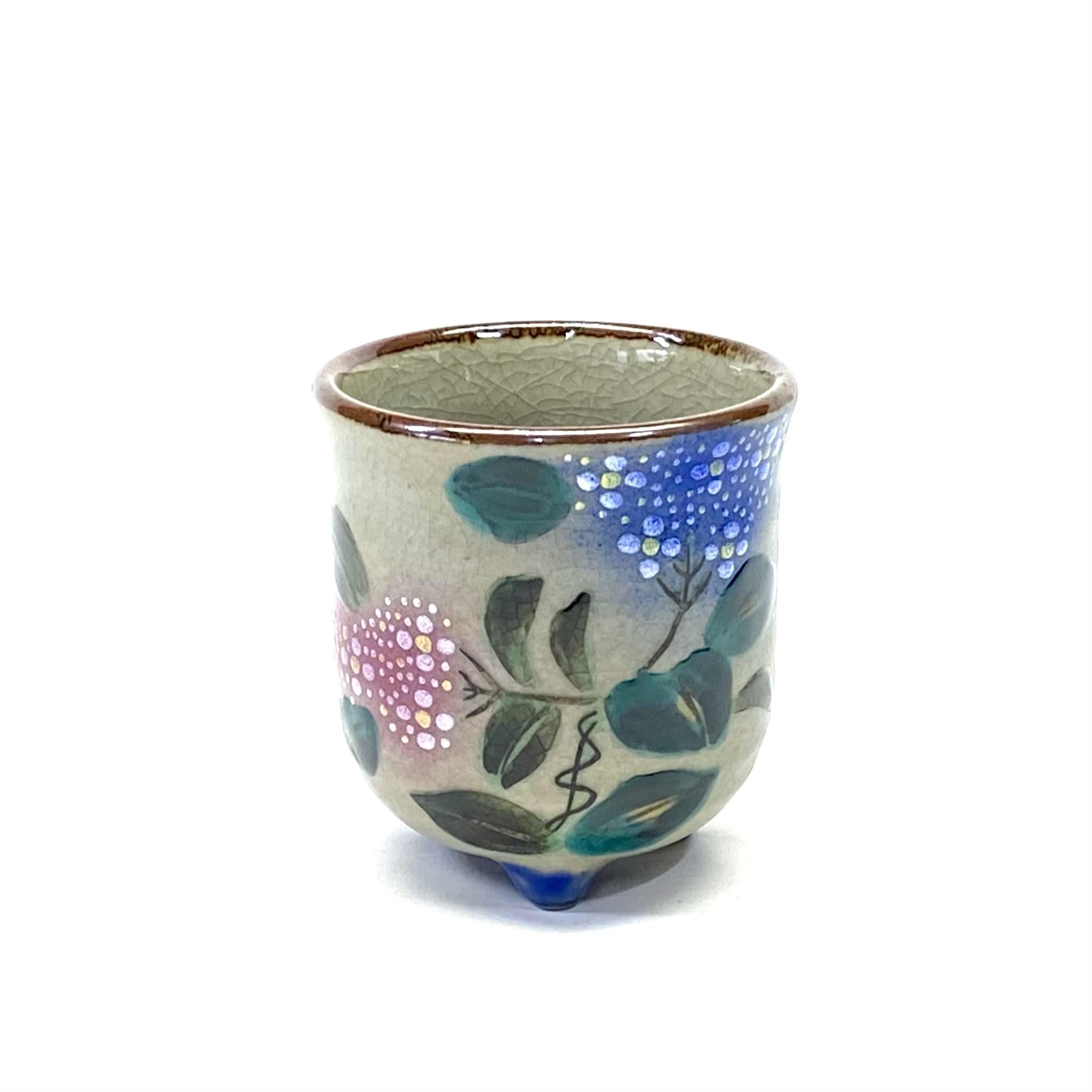 九谷焼 五客湯呑 三つ足 (木米写し/ソメイヨシノ緑塗り/金花詰/吉田屋万年青/がく紫陽花ピンク&ブルー)