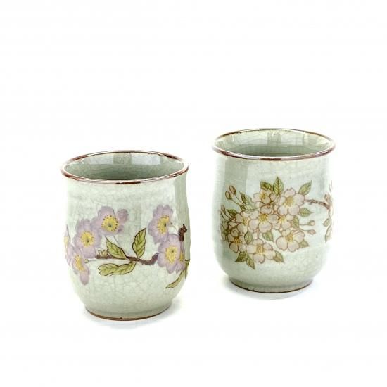 九谷焼の桜シリーズからペア湯呑で淡くやさしいお色のソメイヨシノとしだれ桜です。 シール焼です。