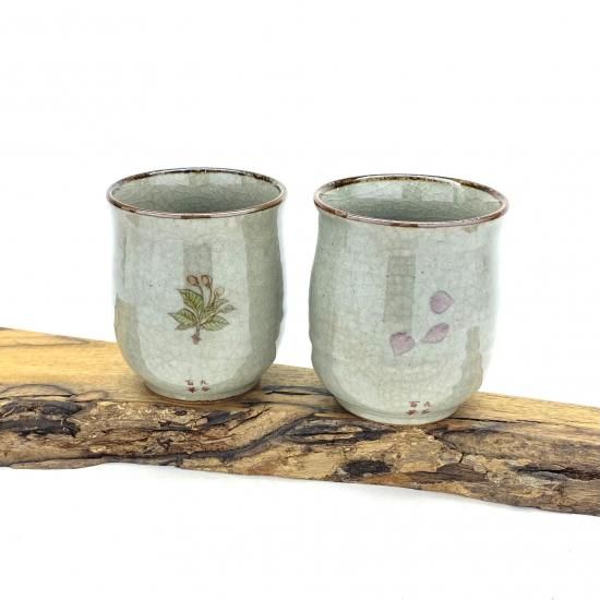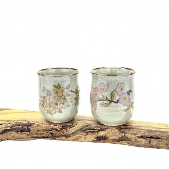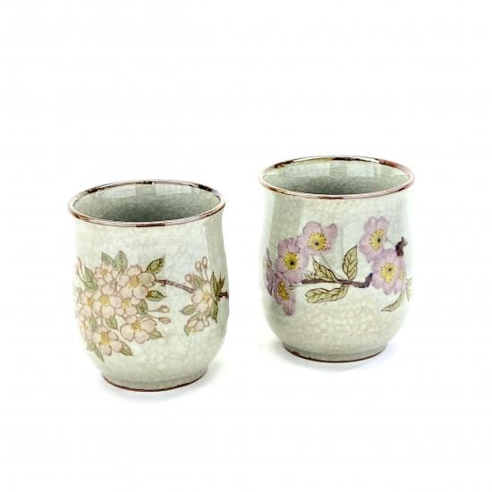 九谷焼の桜シリーズからペア湯呑で淡くやさしいお色のしだれ桜とソメイヨシノです。 シール焼です。