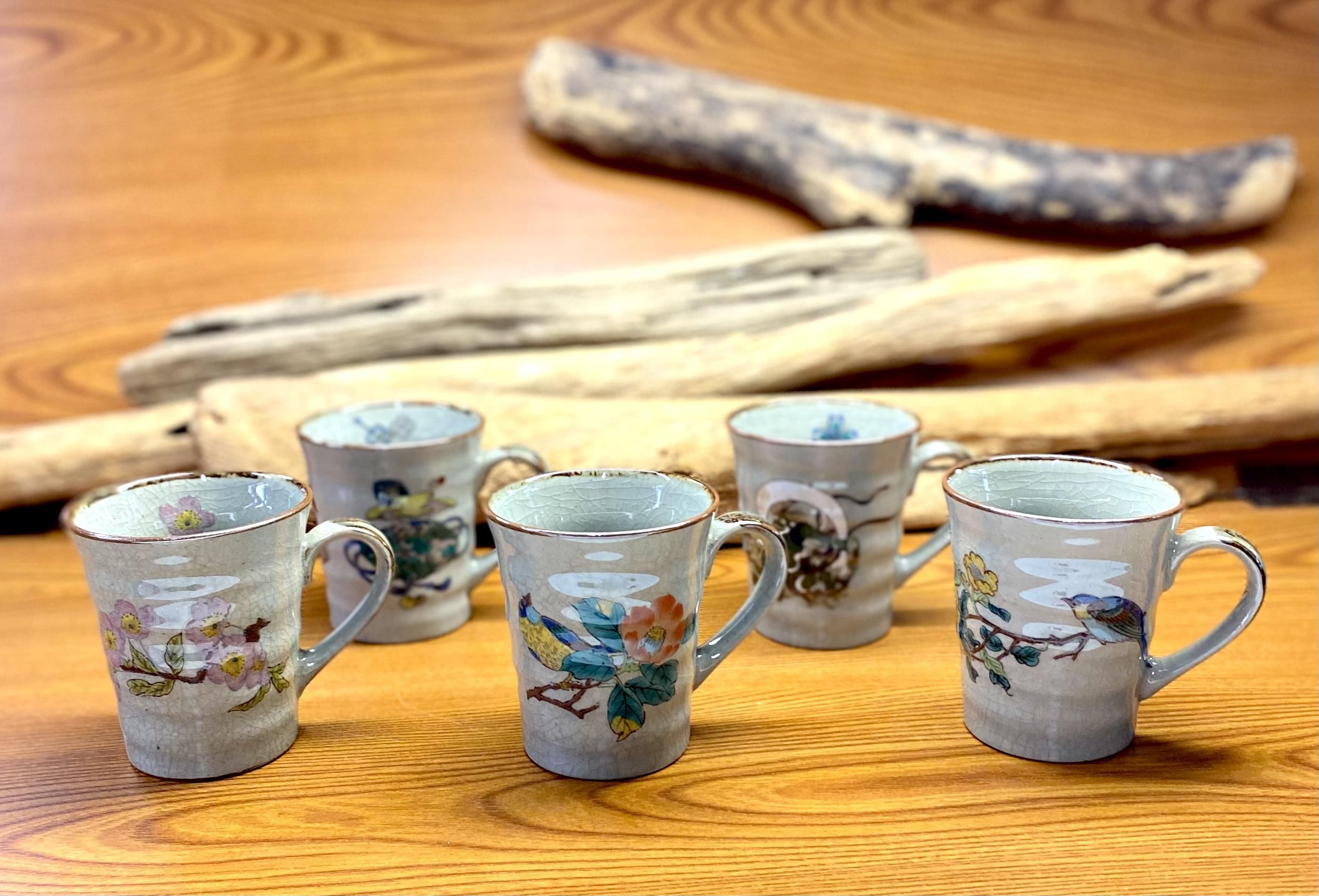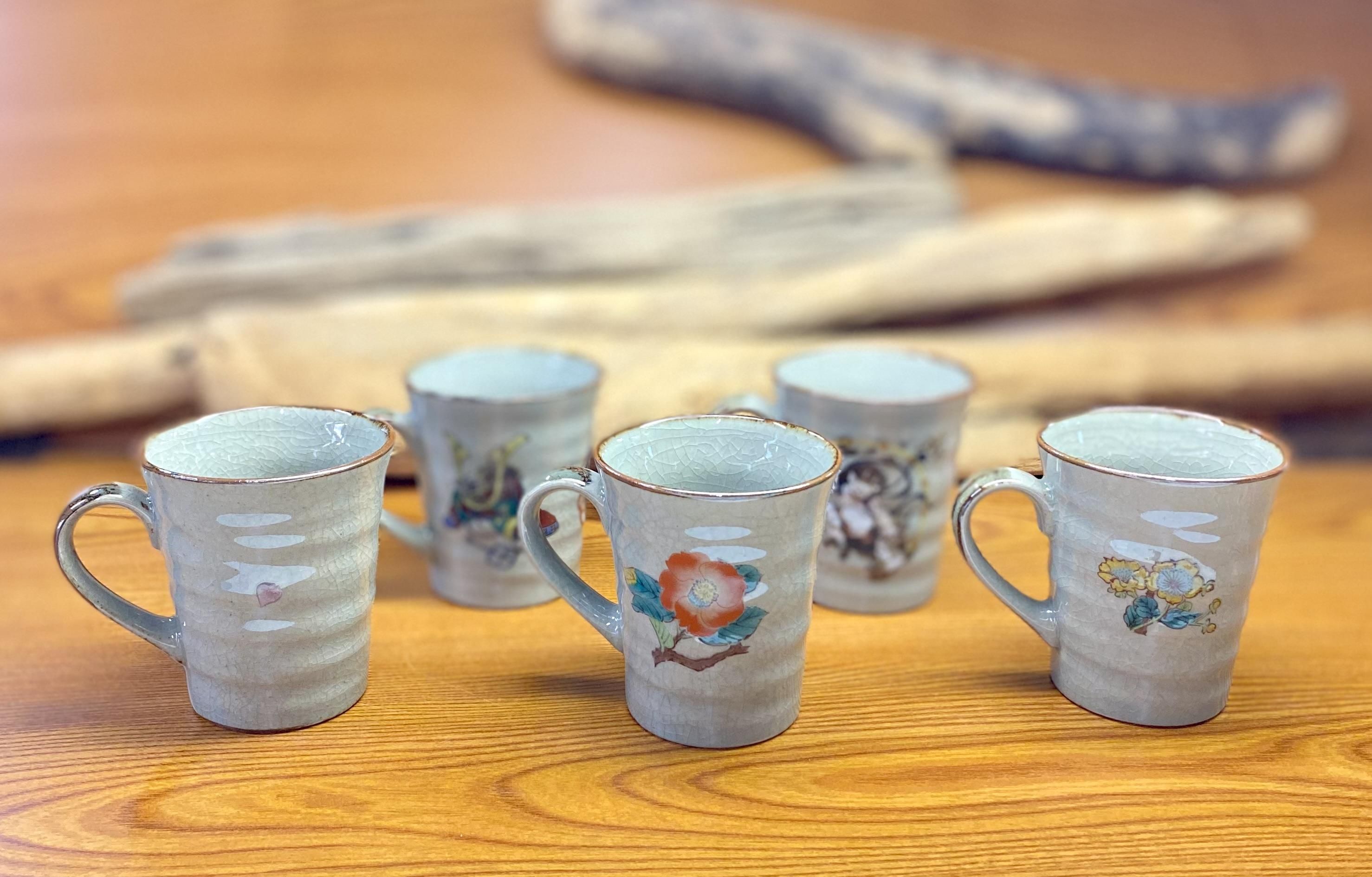九谷焼のお洒落な五客マグをご紹介します。このマグは転写紙焼成で(ソメイヨシノ/椿に鳥/金糸梅に鳥/宝尽くし/風神雷神) の色違い展開です。